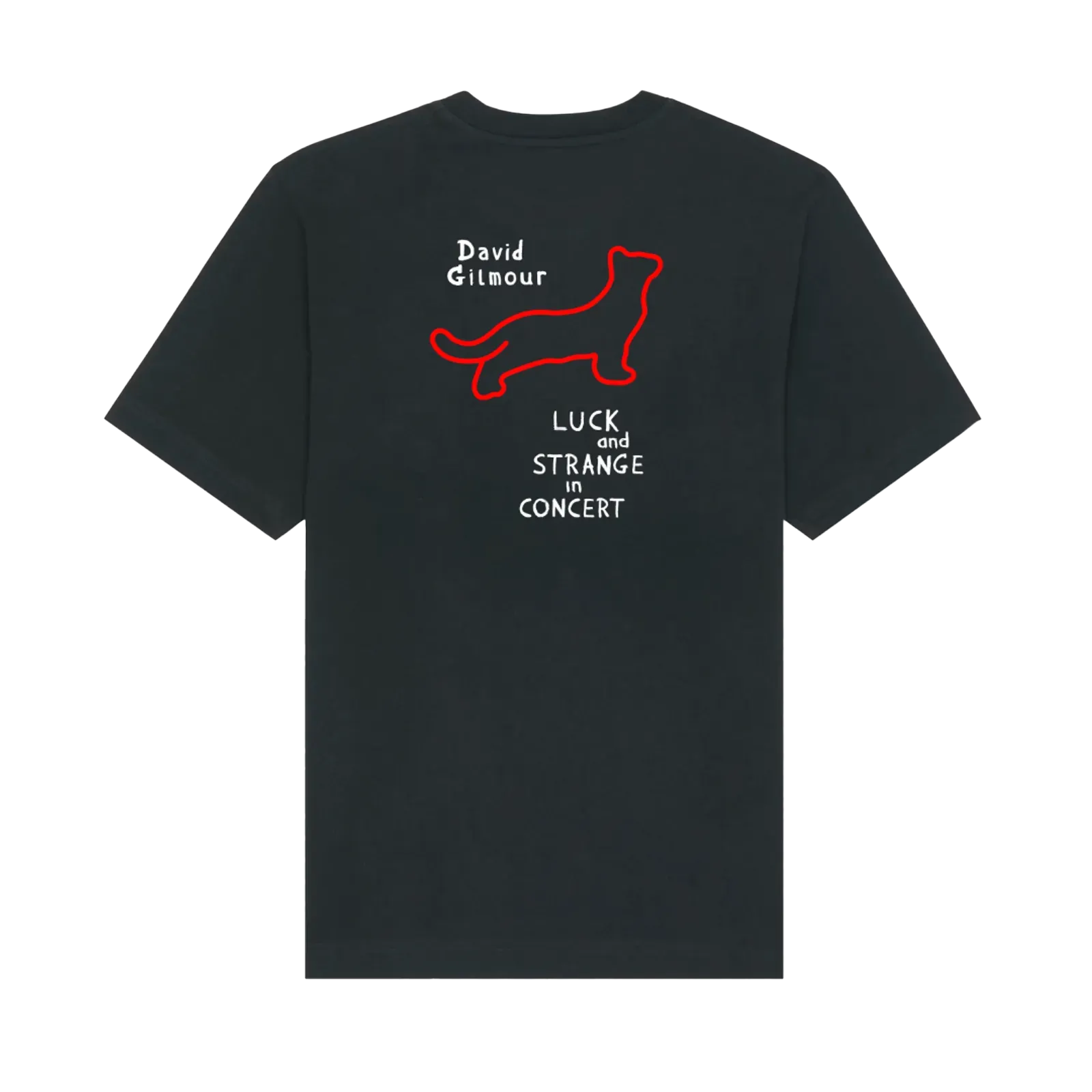 Red Lights Black Cat T-Shirt. Commemorate the magic of David Gilmour's 2024 Tour with the Red Lights Black Cat T-Shirt. Showcasing an exclusive tour photograph captured by Gavin Elder on the front and the iconic black cat silhouette on the back, this shirt pays tribute to Gilmour's masterful performances across the EU, UK, and US. Screen printed on Stanley/Stella Freestyler Relaxed Heavy T-Shirt. 100% Organic Cotton. 240gsm.